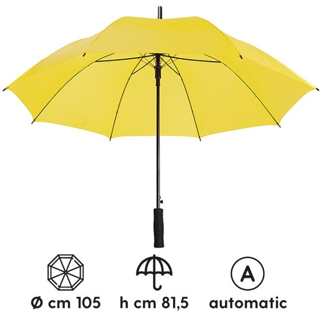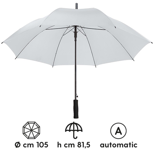 Ombrello automatico sistema di apertura con meccanica di alta qualità struttura in fibra di vetro alta resistenza fusto in metallo puntale in plastica nera manico in eva chiusura con velcro tecnica di stampa consigliata: serigrafica- transfer
