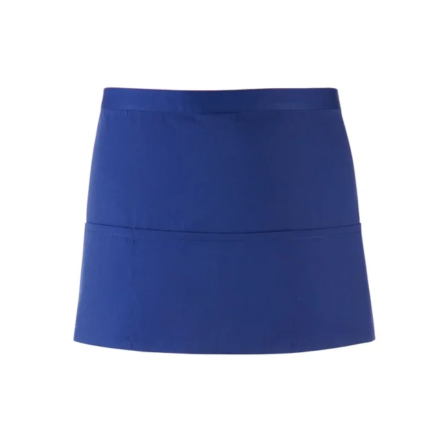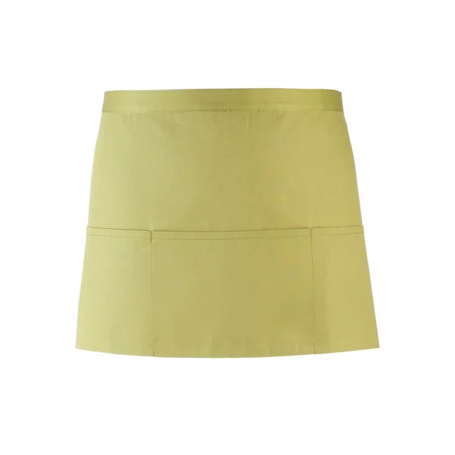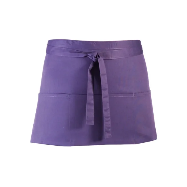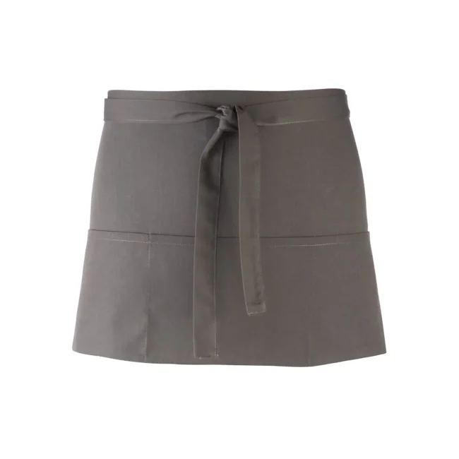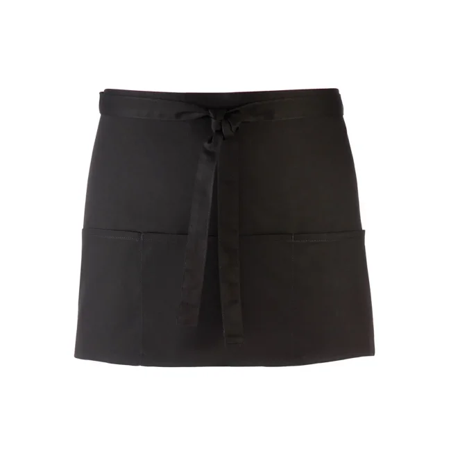 65% poliestere, 35% cotone twill. Grembiule corto in stile bar con tre tasche frontali, allacciatura posteriore con lacci da 90 cm. Lavabile a 60° in lavatrice domestica, e 85° in lavatrice industriale.