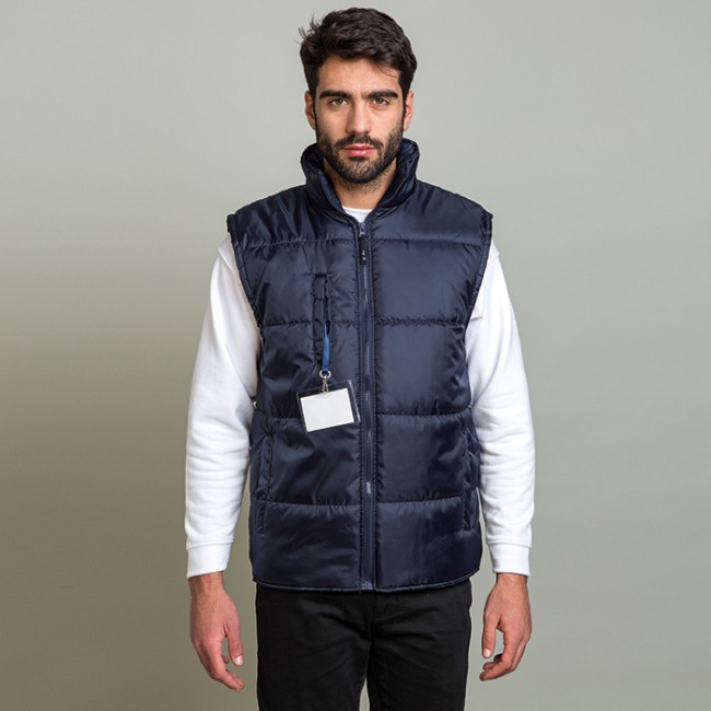 giubbino smanicato in poliestere zip lunga con cursore removibile tasca interna tasca frontale verticale con badge a scomparsa due tasche laterali