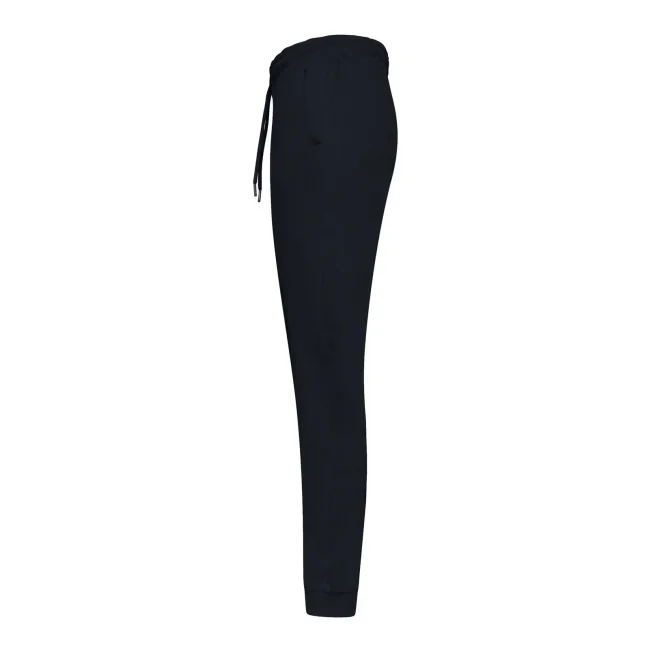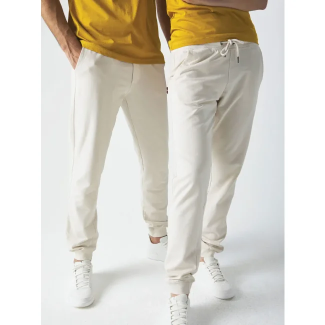 80% cotone, 20% poliestere. Pantaloni in French Terry, interno girovita e tasche in jersey, tasca posteriore applicata, fondo gamba a costine 1x1, cordini tondi tono su tono con punta in metallo, occhielli in metallo, impuntura flatlock su tutte le cuciture. Etichetta strappabile. Interno felpato ed esterno in 100% cotone, per una migliore stampabilità.