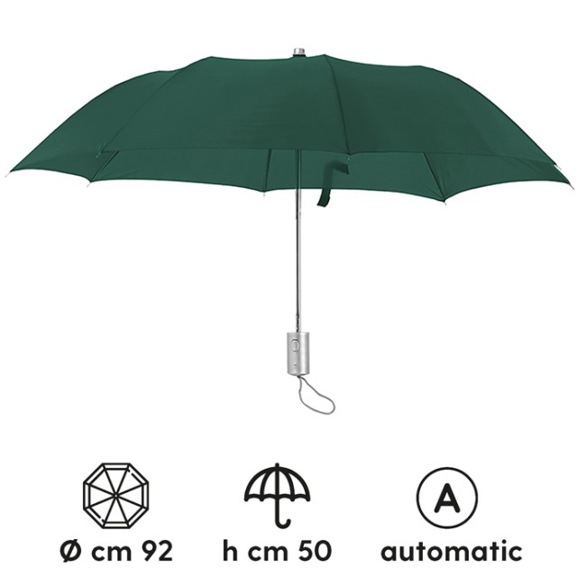 Mini ombrello automatico con fodero fusto in metallo manico in plastica silver antigraffio rib in metallo temperato e rinforzato laccio da polso chiusura con velcro tecnica di stampa consigliata: serigrafica - transfer
