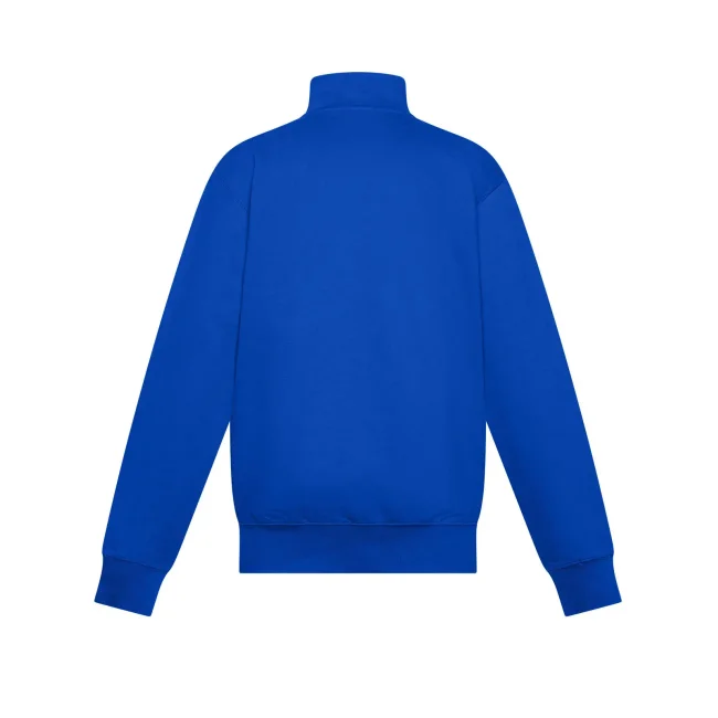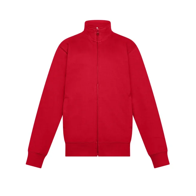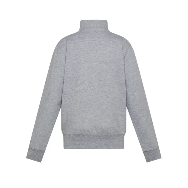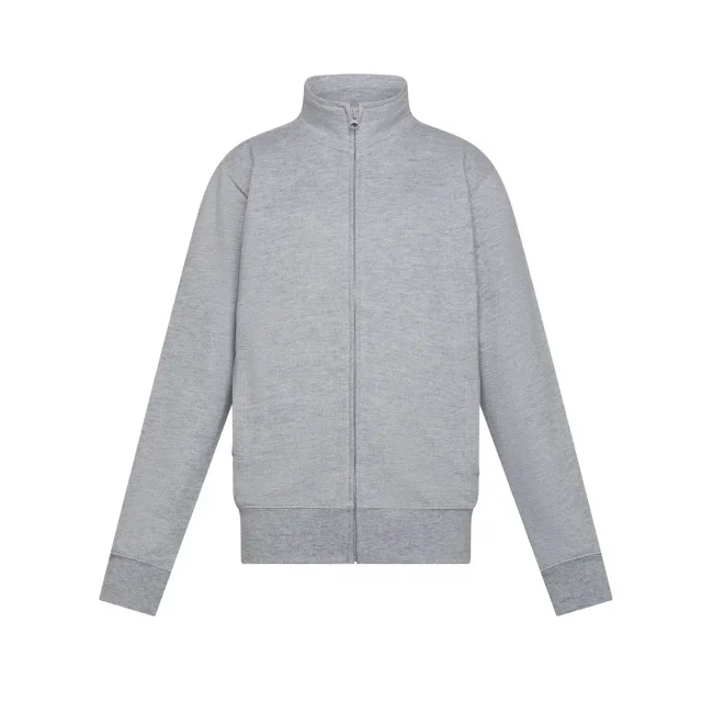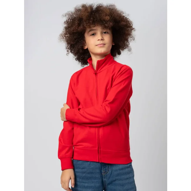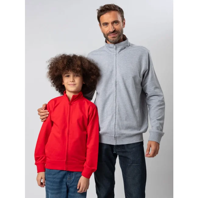80% cotone, 20% poliestere. Felpa in French Terry per bambino con zip intera, maniche set-in e collo alto. Presenta tasche a filetto, polsini elasticizzati e orlo inferiore in costina elasticizzata che garantiscono una vestibilità confortevole. La cucitura laterale assicura una forma che si mantiene nel tempo. Tessuto esterno 100% cotone, che garantisce un'eccellente qualità di stampa. Trattamento peach finish all'esterno. Etichetta strappabile.