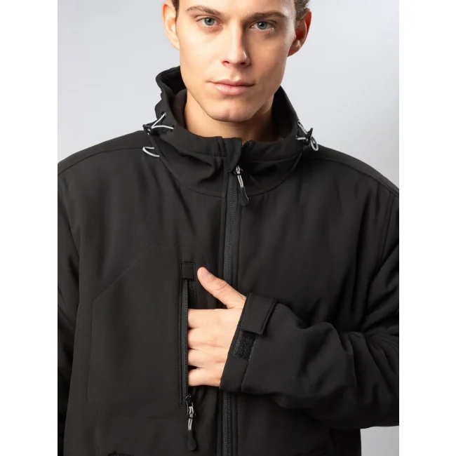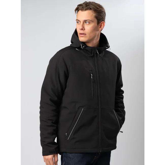 Tessuto esterno: 94% poliestere riciclato, 6% elastan. Strato interno: 100% poliestere. Imbottitura: 100% poliestere.. Giacca in Softshell 3 strati, imbottito con cappuccio regolabile con coulisse. Tessuto in poliestere ririclato ecosostenibile, antivento, antipioggia (impermeabilità 8000 w/p), con traspirabilità 1000 mvp. Polsini regolabili con velcro, comode tasche frontali con zip e piping riflettente, tasca sul petto con zip. Comoda zip sul a fondo capo per facilitare la personalizzazione. Etichetta taglia tessuta al collo, logo e istruzioni lavaggio sul fianco strappabile.