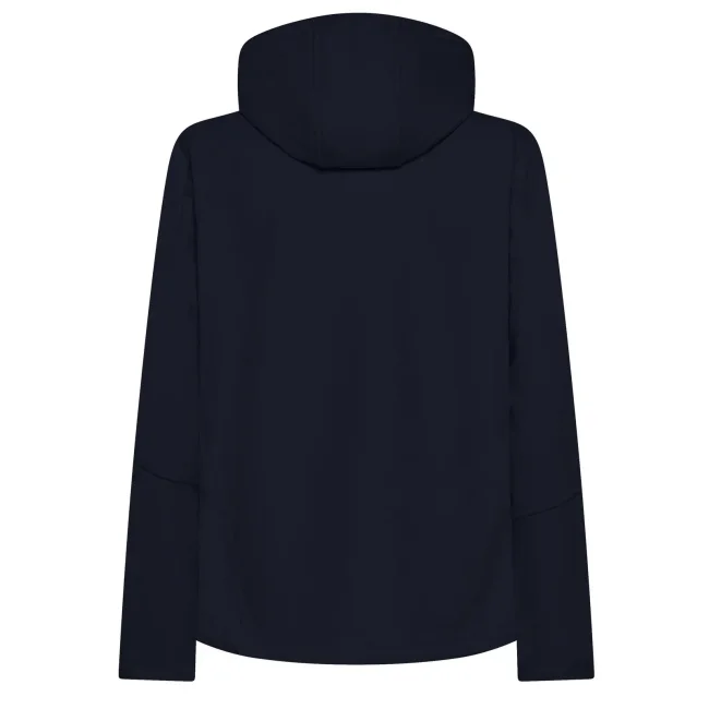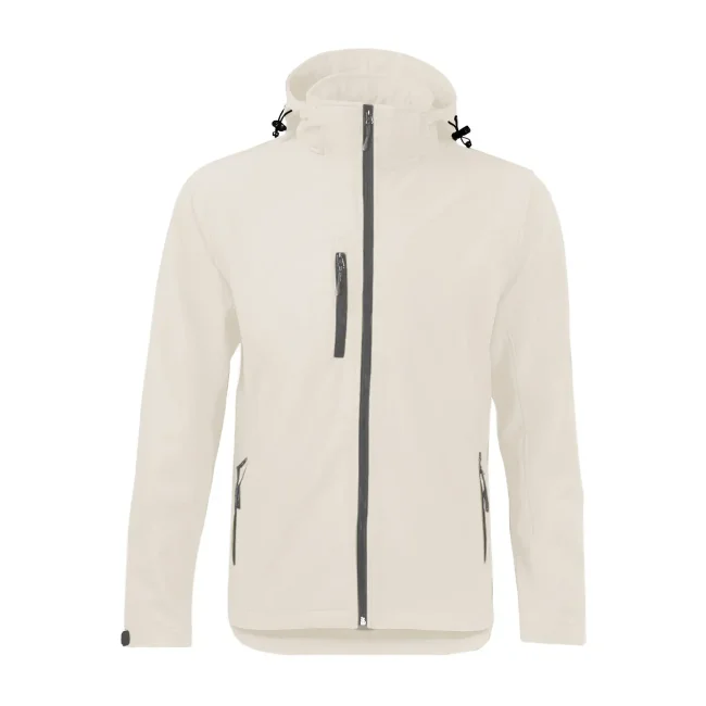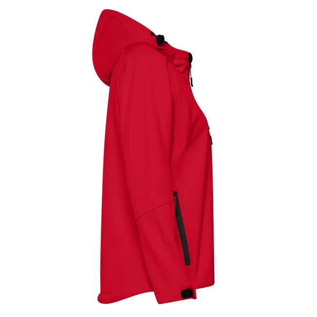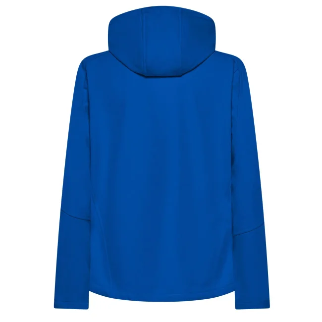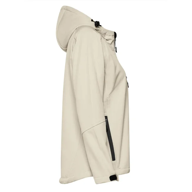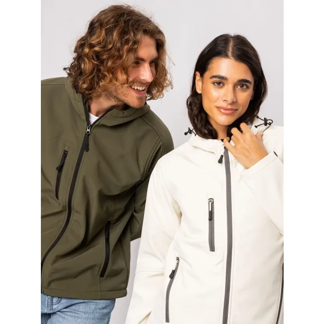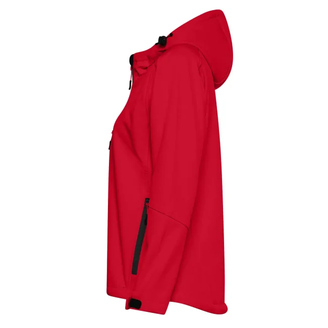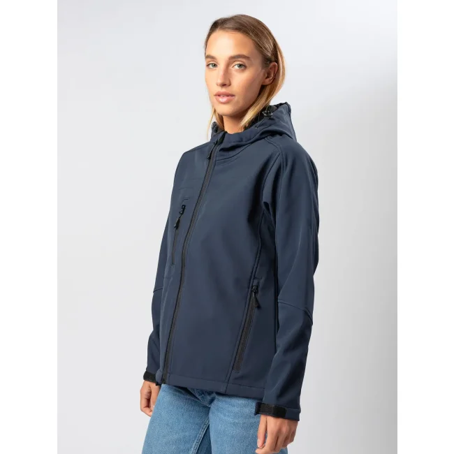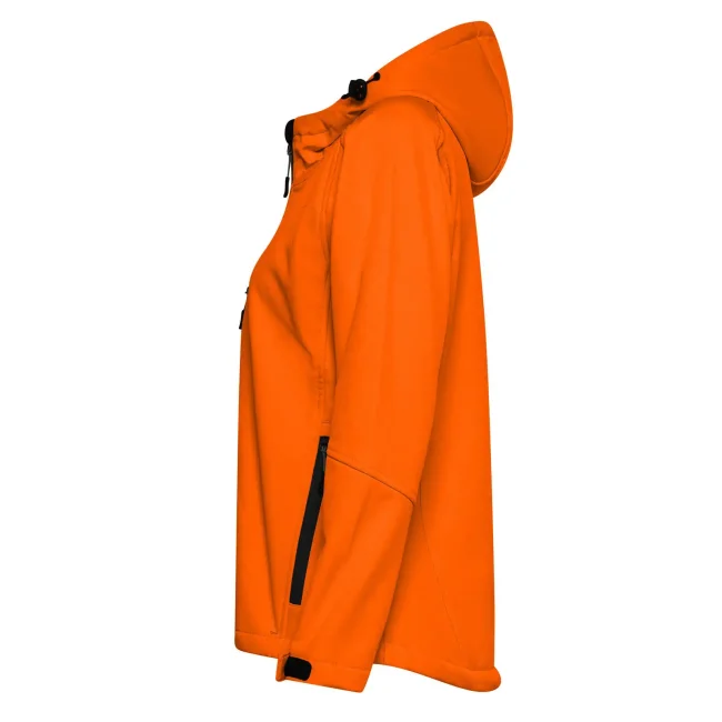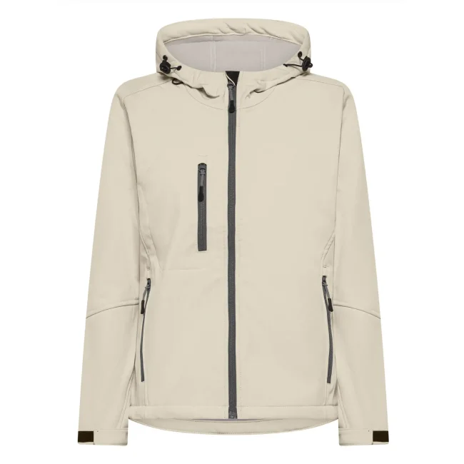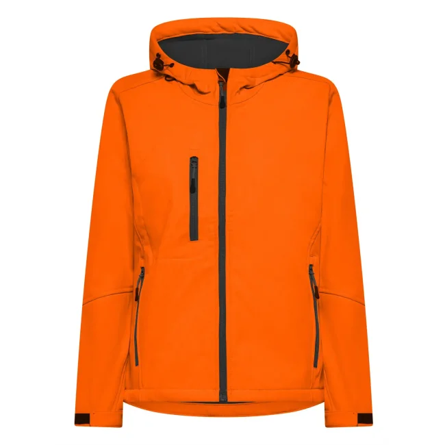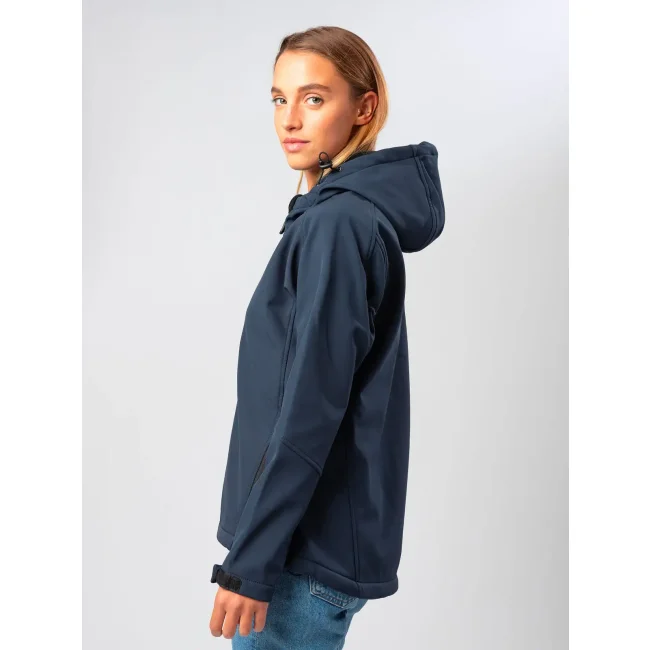 94% poliestere, 6% elastan. Giacca da donna softshell a 3 strati con cappuccio e girovita regolabili tramite coulisse. Dotata di tasche laterali pratiche e taschino sul petto con zip. Include una zip interna sul lato cuore per facilitare la personalizzazione. Tirazip in plastica, polsini regolabili con velcro e interno in morbido micropile. Dettagli in contrasto, come zip, tirazip e coulisse neri. Impermeabilità 8000 mm, traspirabilità 1000 gr/m². Etichetta removibile.